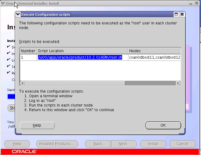 - At the Execute Configuration Scripts screen, run the scripts as requested on all nodes, then click OK to continue.